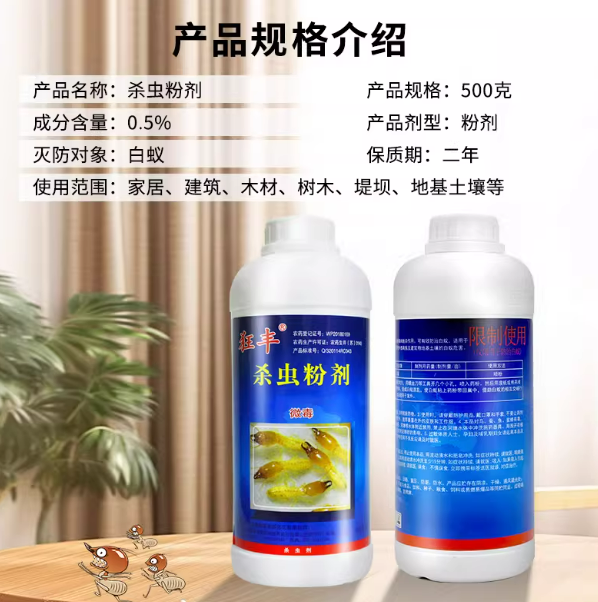 狂丰杀虫粉剂氟虫腈含量0.5%白蚁药是郑州洁万家生物科技有限公司针对白蚁防治痛点研发的核心产品,核心特点为“连锁传染+全窝清除”。其粉剂通过白蚁体表接触吸附,药剂进入体内后不立即致死,通过白蚁间清洁、喂食等群体行为快速传播至整个蚁巢,包括蚁后、蚁王及幼虫,最终实现全巢死亡。产品同时具备“防杀一体”功能,灭杀场景下可直接撒施于白蚁活动轨迹、蚁巢入口、蛀蚀孔洞;预防场景下可在装修木材缝隙、地基土壤、树木根部周围形成防护屏障,预防有效期长达3-5年。