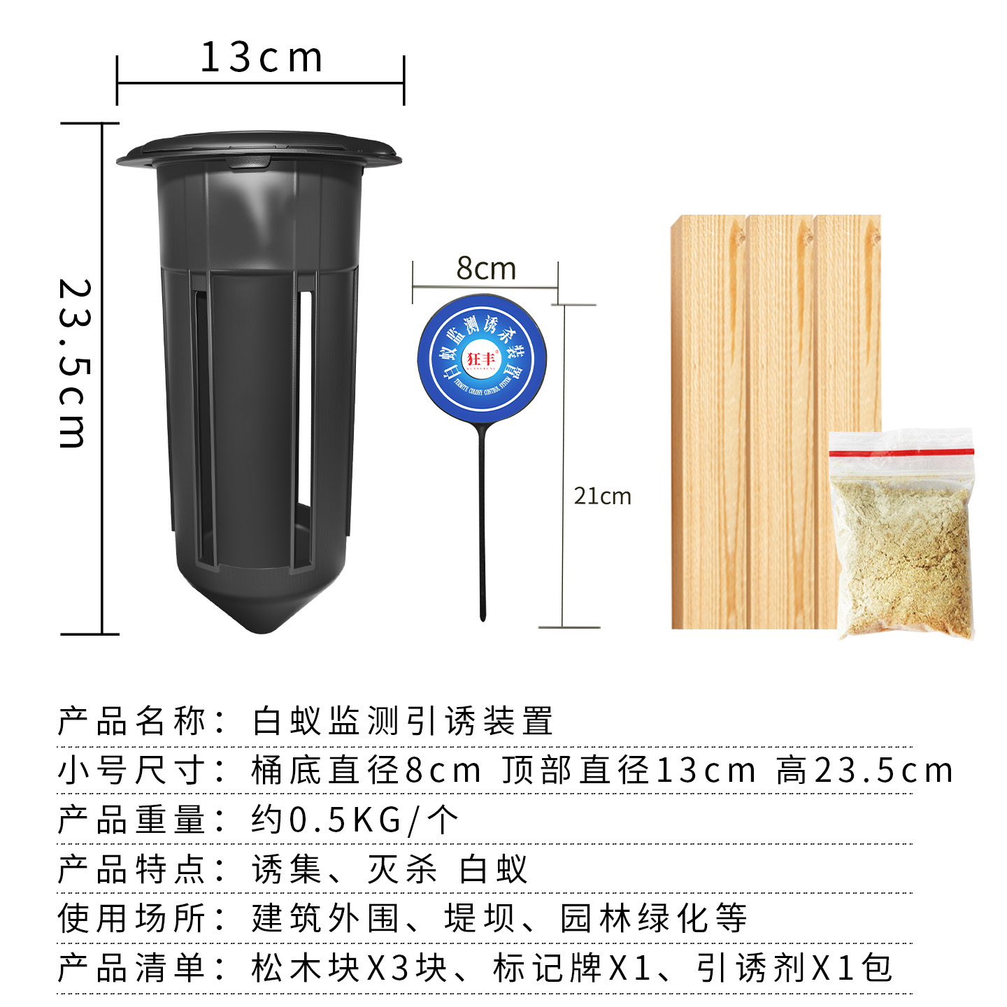 “狂丰地上型白蚁诱杀箱”的核心优势在于:采用高透亚克力观察窗,无需拆解即可直观查看白蚁活动;搭配植物性诱饵与专用信息素,引诱半径达5-8米,效率比传统诱饵高3倍;灭杀成分通过“交哺行为”传递,灭杀成功率达95%以上;材质为食品级环保材料,防水耐腐蚀,使用寿命3-5年。