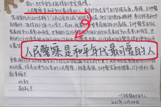 不久前,广州游客向女士在亚布力镇不慎遗失了存有重要工作文件和珍贵照片的手机。因行程匆忙,她只好先行返程,返程中向尚志市公安局亚布力派出所打了报警求助电话。亚布力派出所立即组织警力根据向女士提供的信息连夜开展查找工作,最终找回了手机。向女士得知后激动不已,于是手写了一封感谢信,称赞民警是“和平年代最可爱的人”!