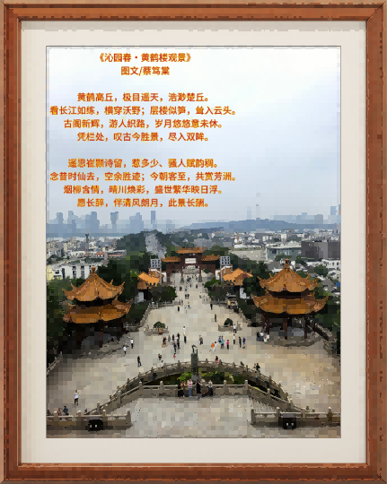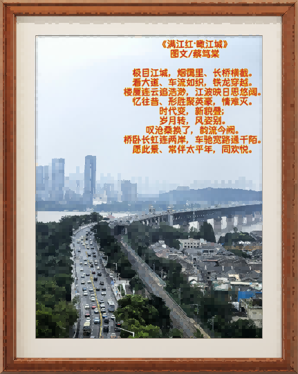 蔡笃棠先生在诗词创作中展现出了卓越的传统继承与创新才能。他深谙古典诗词的格律精髓,却能以现代人的视角和情感为其注入新的生命活力。在《沁园春 ·黄鹤楼观景》中,我们既能看到”长江如练”这般典雅的传统意象,又能遇见”层楼似笋”这样极具现代特色的新颖比喻。这种古今意象的巧妙融合,不仅拓展了传统词牌的意境空间,更展现了诗人立足当代、回望传统的独特视角。其《鹧鸪天 ·登楼览胜寄怀》中”城开画卷千层翠,楼映天光万缕长”的描写,既延续了古典诗词的意境美,又融入了现代城市的壮丽景观,形成了一种跨越时空的审美对话,彰显出传统艺术形式在新时代的强大生命力。