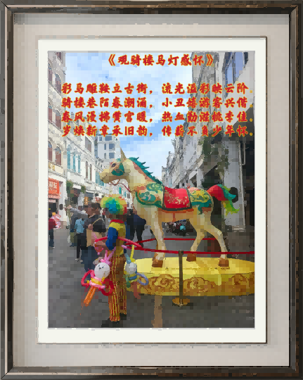 骑楼巷陌春潮涌,小丑嬉游客兴偕。