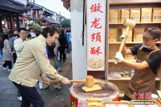 10月26日,龙宇飞体验制作杭州地方美食龙须酥。 王逸飞 摄