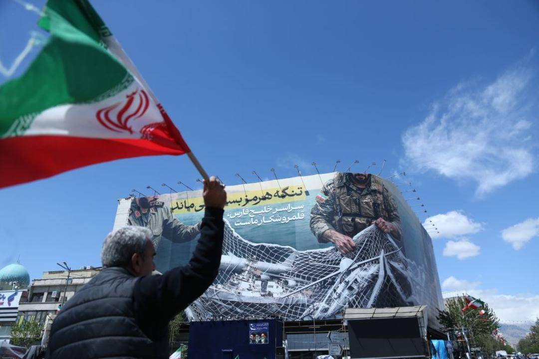 4月8日,一名男子在伊朗首都德黑兰革命广场参加集会。新华社记者 沙达提 摄